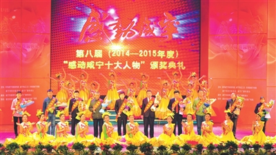 昨晚,由市委宣传部、市总工会、共青团咸宁市委、市妇联、咸宁广播电视台主办的第八届“感动咸宁十大人物”颁奖典礼在市会议中心举行。