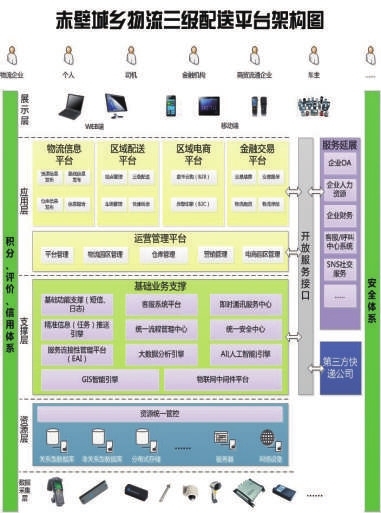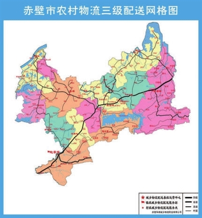 赤壁市农村物流三级配送体系即以康华智慧物流园为依托,建设了1个赤壁市农村三级物流配送中心,1个农村日用品仓储中心,1个农村药品配送中心,8个镇级物流综合服务站,140个村级物流综合服务点,开通了6台专线物流班车,按照统一建设、统一管理、统一标准、统一运营“四个统一”原则,实现商品流、信息流、资金流、人气流“四流合一”。通过分拣下乡快递包裹,整合城市渠道商和农村专业合作社资源,逐步打通工业品下乡和农产品进城的物流通道,努力解决电商物流“最后一公里”瓶颈,形成赤壁农村物流三级配送服务体系。其站点辐射小区、镇、村,同时建成集数据交换、信息发布、智能配送、库存管理、决策分析等功能于一体的三级交通物流电子商务平台,能有效提高农村物流网络连通度和覆盖面,形成货畅其流、快捷准时、布局合理、双向高效、种类丰富、服务便利的三级物流服务格局。