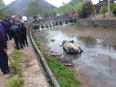 记者到达刘家桥后看到,交警正在现场勘查,马路边堆放着几件小孩和大人的衣服,在落差约有4米高的河床上,一辆挂有通山牌照的出租车四脚朝天躺在上面,所幸河水较浅,出租车没有被河水淹没,但车头和车尾受损严重,车内许多物品掉落在一旁。