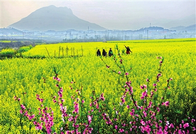 再次走进阡陌人家,写一阕回乡曲,记一路思乡情,山岗望原野,自是无框画,窗口观田园,有画入框来。 梦幻乡村,村落棋布,新绿嫩黄,桃红李白。一眼望不到边的油菜花,波连云涌;一笔写不尽的大观园,花海茫茫。