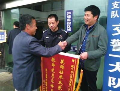 4月6日上午,身体已无大碍的阮班早与5位村民一起敲锣打鼓来到市公安局交警支队一大队,送来了一面写有“英雄壮举义感天下,救命之恩永世不忘”的锦旗,同时向救人英雄岳强当面谢恩。