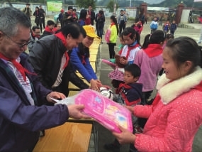 活动现场,来自武汉、咸安、通山三地的数十名爱心人士向新屋村德勤希望小学的学生们赠送了足球、洋娃娃、烤暖器、书包、羽毛球拍、书籍等小礼物。
