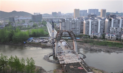 昨日,记者在淦河大桥施工现场看到,桥身的A形索塔矗立在淦河上,即将封顶。据了解,淦河大桥全长144米,宽25米,预计今年10月建成通车。 赵忠志/摄