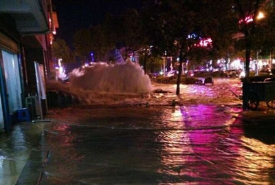 当晚9时许,记者在市区文笔路青龙山高中附近看到,爆裂水管已被堵住,路面积水正慢慢排走,两台挖掘机在现场紧张施工。