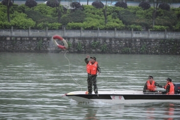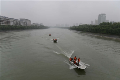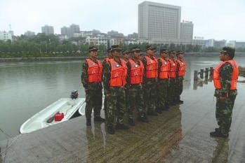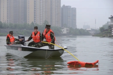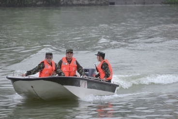 昨日上午9时,天空下着淅沥沥的小雨,20名武警官兵驾驶着3艘冲锋舟,在淦河双鹤桥段巡逻。