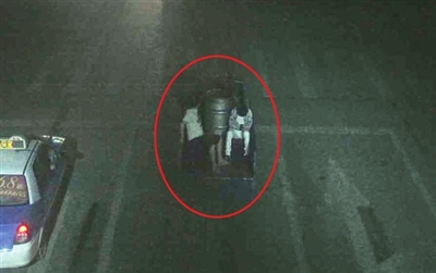 据事发现场路面的监控卡口显示,肇事车辆为一辆载货三轮车,无牌照,载有一个1.4米左右高的铁桶,后面坐着两个青年人(见图片)。肇事者撞人后往发展大道方向或新政府方向逃逸。