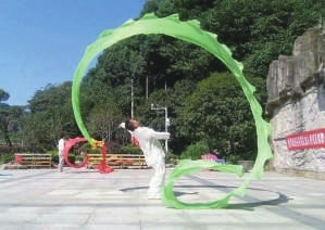 舞龙绸的发起人刘纪三年前随妻子到咸宁,他是湖北省营养学会的会员,自己开设以食疗为主的养生馆,他把武当山的舞龙绸带到咸宁。他告诉记者,舞龙绸的龙头5-7斤重,绸子10米长。之所以向市民推荐舞龙绸这个项目,因为舞龙绸实际上是一个延长了的“流星锤”,将龙头通过手中的绳子抛向空中,上下左右腾挪,达到炼气,气通血通,加速血液循环,新陈代谢的效果。舞的过程中有太极的动作力量,身体的经络不会出现淤堵,可以达到强身健体的目的。刘纪告诉记者,先后在他这里练过的队员有300多人。队员年龄跨度比较大,小有19岁,大的有60多岁。舞龙绸在音乐的伴奏下,彩绸随着龙头在空中变化出美丽的“空中弧线”,美感十足。