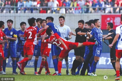 武汉宏兴开球后,主裁随即便吹响了比赛结束哨音。但比赛哨音一响,武汉宏兴球员便冲向苏宁球员,吴曦还被对手从身后踹了一脚。而看台上也是扔下无数矿泉水瓶,导致现场一片混乱。