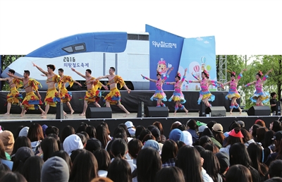 5月5日至9日,受韩国友好城市京畿道义王市邀请,市歌舞剧团一行赴韩开展文化交流。活动期间,剧团代表我市参加了义王市铁路节,精心创作了通城拍打舞《拍打歌》、《牛角砰碰情》、双人舞《梦喜》、呜嘟演奏等一列体现了我市民俗特色的节目,演出赢得了当地观众和艺术家们的高度赞扬。赵忠志 陈鹏/摄