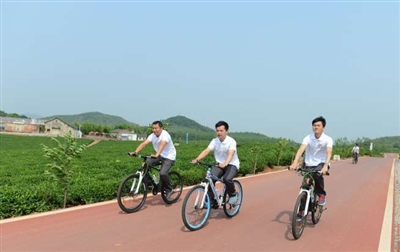 16日,数位市民骑车穿行在赤壁万亩茶园自行车慢行公园中,感受无边绿色,尽享运动之美。