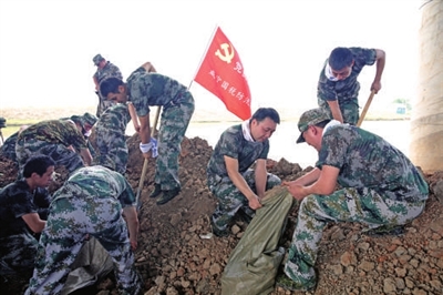 7月10日,市国税局防汛抢险突击队员在嘉鱼县渡普镇西凉湖参与防汛固堤任务。图为突击队员们顶着烈日装沙袋加固江堤。 程俊/摄