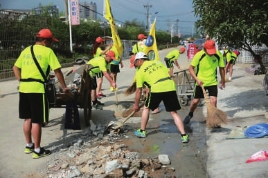 用力清扫、来往推车、挥舞铁锹……志愿者们三五成群,分工协作,个个挥汗如雨,把街头上遗留的淤泥和垃圾一一清扫到位,不留一处死角。经过三个多小时的奋战,几条街道顿时变得干净整洁。