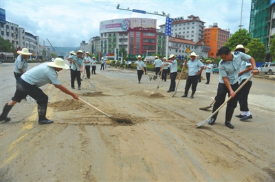 为方便居民出行和生活,该县召开紧急专题会议,组织全县干部职工对城区街道开展“三清一防(清运泥沙、清扫垃圾、清洗街道、卫生防疫)”工作。
