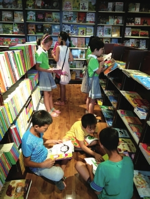 一大早,小朋友们就坐着客车进了城区,在老师的带领下来到咸宁书城,看到书架上玲珑满目的儿童书籍,个个全神贯注,捧着不放,认真看了起来。有席地而坐的,有依柜而站的,有趴在书桌的。一群小朋友在书架上找到了《泡泡贴》后,个个兴奋不已,围坐在地板上就贴了起来。还有几个小男孩发现了专门提升孩子专注力的《125游戏》,不用人教就在《走谜宫》里走了起来,是那么的专注。