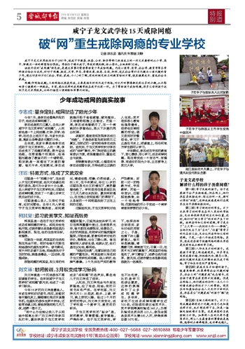 子龙文武学校的“秘诀”是,封闭教学、军事管理;爱字铺路,严得科学。在子龙文武学校,学生不比吃穿,比的是学习和综合素质,这样的氛围吸引了众多戒网瘾学生。多年来,该校不仅成功戒掉网瘾学生近100名,还陆续向湖北省武术队、武术学院等高校输送346人;为部队输送优质兵员320人,参加全国各类武术比赛885人次,获得奖牌总数1675枚。