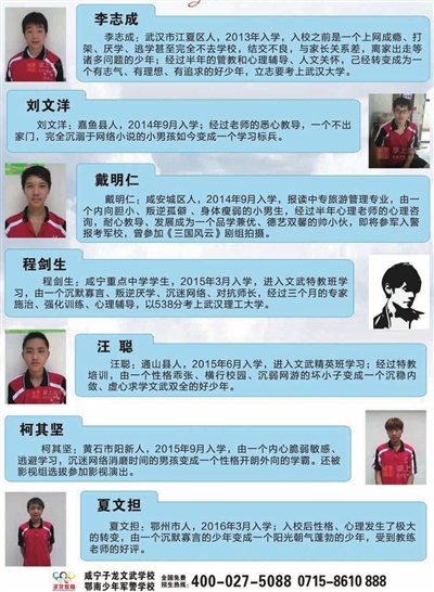 李志成是武汉江夏人,去年入学咸宁子龙文武学校“戒网瘾”。入校前他是一个上网成瘾、打架、厌学、逃学;在社会上结交不良,与家长关系差,离家出走等诸多问题的少年。