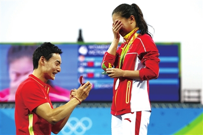 北京时间昨日,中国跳水队队员秦凯(左)向队友何姿求婚并获成功。当日,在2016年里约奥运会跳水女子3米板决赛中,中国选手何姿以387.90分获得亚军。