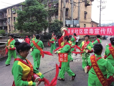 在阳光社区,一支由社区老同志组成的锣鼓队长期活跃在禁毒进社区宣传一线,大家将禁毒宣传知识编入歌舞中,载歌载舞的宣教形式在基层社区落地生根。