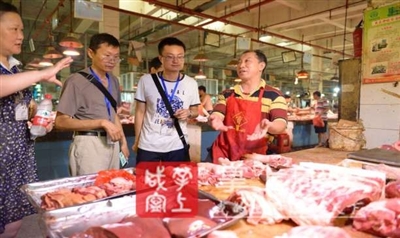 “今天排骨多少钱一斤?五花肉呢?”魏师傅左手拿着智能手机,右手指着摊前的猪肉一一询问,摊主站在一旁,给“老熟人”一一报出价格,应对十分老到。接着,魏师傅把了解到的数据熟练地输入智能手机。