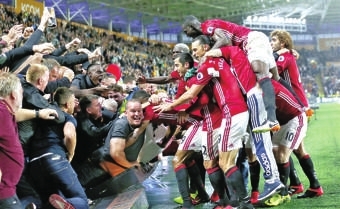 曼联全队在边线处已抱成一团,场边的球迷兴奋得想要冲进场内。穆里尼奥则握紧拳头跳了起来,随即冲进了曼联的替补席与伙伴们拥抱。不过穆帅还没忘了提醒最后一个将要被换上场的斯莫林赶紧脱下外套准备出场。