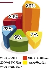 在8月份所销售的住宅中,2000元/平方米以下占比9%、2000-2500元/平方米占比22%、2500-3000元/平方米占比38%、3000-4000元/平方米占比24%、4000元/平方米以上占比7%。其中,2000-2500元/平方米价位的住宅占比,较前一个月减少6个百分点。