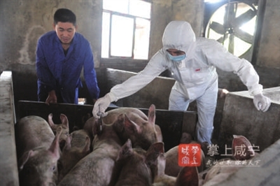 春秋两季是集中防疫期,疫苗需低温保存,有些疫苗必须在两个小时内使用,否则会失效,为了赶时间,徐嵩山每天早上五六点钟,骑着摩托车前往乡镇的养殖场给动物打疫苗。常常从这户农家的圈里跳出来,又急匆匆地赶往下一家,索性把皮鞋当拖鞋穿。长期从事防疫工作,徐嵩山练就了很多绝活儿。现在,各种动物看到徐嵩山都不像原来那样满圈躲了,而是乖乖听他指挥。