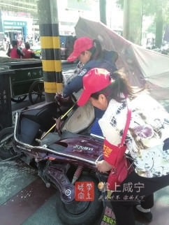 昨日下午,在市区沃尔玛购物广场对面的人行道上,两位头戴小红帽、臂挂红袖章的停车管理工作人员正在将一辆被风吹倒的电动车扶起(如图)。