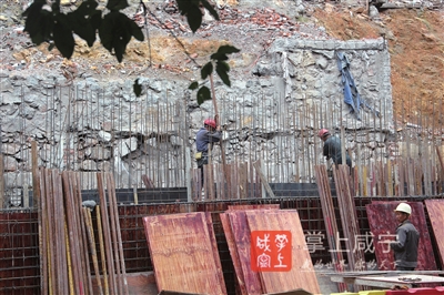 昨日,施工人员正在对城区月亮湾路一处山体进行生态修复。据悉,该工程拟投资230万元,属“两山一河”环境整治项目的一部分。目前正在进行的地基修复,主要是为防止山体滑坡,后期将对山坡实行绿化和亮化。 王奇峰 虞聪/摄