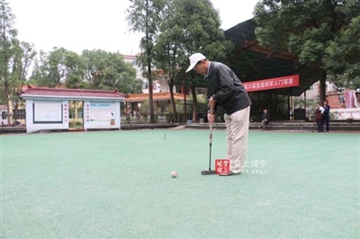 75岁的汪诗鑫头戴白色运动帽,身穿深灰色外套,精神矍铄。他凝神屏气,稳握球杆,用脚踩着一颗球,抬手挥动球槌,只听“砰”的一声,小球不偏不倚顺利过门。“好球!”场外一阵喝彩声。