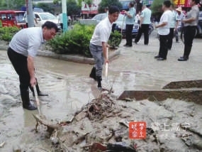 今年7月17日,通城县遭受特大暴雨袭击。大灾过后,北门民政局、肉联、博仁广场等受灾区路面上积压厚厚一层淤泥,有的的位置达到40cm。在任务紧急的情况下,局领导迅速调度小挂车、压缩车、转载机、洒水车司机配合、参与清理工作。有些司机正在休假,也毅然投入到救灾中。看到路面淤泥成积,一片狼藉,有的干部职工顾不上穿雨靴,直接脱掉鞋子站在淤泥中清理,将铲出的垃圾淤泥倒入小挂车中,再由压缩车转运,接着就由洒水车冲洗干净。局领导和一些职工脚被泡肿、衣服被雨淋湿了,没有一个人叫苦叫累,中午饿了全体干部职工就在街道上吃盒饭,累了就坐在街道上休息片刻。仅仅3天时间,隽水城区的所有垃圾被清理,城区受灾街道、小区也基本冲洗干净,实现了大灾不见灾的目标。