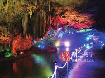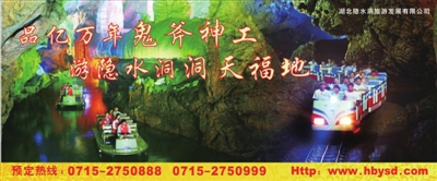 “神奇隐水洞,十里水画廊”。隐水洞将向游客展示鬼斧神工的神奇精彩和动人心弦的故事,让您领略触摸大自然的奇特的地下世界。景物如玉琢精雕,洞中仙境惟妙惟肖;潺潺流水,碧潭清澈,轻舟荡漾,飘飘欲仙;宏大的钟乳群体造型别致,在荧光闪烁下流光溢彩,华丽胜似天宫;当您乘坐洞内火车在迷宫中穿行,好似神仙下凡,梦幻无穷;罕见的洞穴生物,犹如外星来客,与人共舞,独特景观让您大饱眼福。百闻不如一见,洞中一游,将使您终身眷念,获益匪浅。是湖北省命名的首家地质公园,被专家喻为“洞天华中—中华天洞”和“神秘的地下明珠宫殿”。
