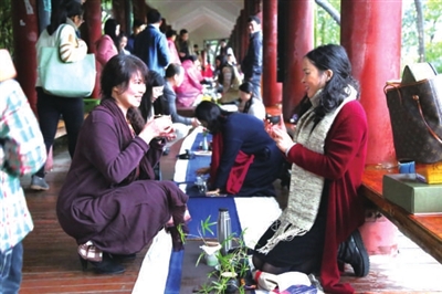 本报讯 (记者 陈婧)10月29日下午,天空飘着细雨,温泉潜山森林公园的文化长廊处,一百余位茶文化爱好者席地而坐,一杯杯香茗驱散了寒意。