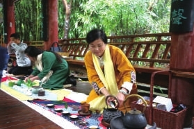 这是“无我茶会”首次走进咸宁,参加活动的茶友们,来自武汉、荆门、咸宁等地。他们身着茶服,入席、备具、净手、泡茶、相互奉茶,四周掩映的修竹,成了妆点茶席的最佳道具。长廊里,不少游客纷纷闻香而来,从席首喝至席尾。“我数了下,总共有50席,每一席用来待客的茶品都不一样,一个下午就将七大茶类喝全了。”家住温泉十六潭公园的胡先生兴奋地说。