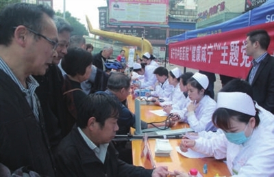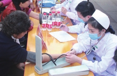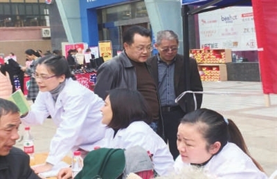 “老人家,您先坐一下,量完这个就给您量。”老年病科主任殷春阳一边给市民量着血压,一边微笑地招呼正在等候检查的其他市民。
