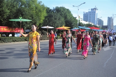 今年55岁的赵艳身高175厘米,刚刚从咸安区烟草局退休。两年前,艺源艺术团开年会,武汉的老师给以赵艳为首的一群身材高挑,气质优雅的阿姨们编排了一曲《太湖美》,32位身着旗袍摇着团扇举着纸伞的大妈惊艳亮相,震惊全场。从那以后,艺术团就成立了模特队,赵艳担任队长。