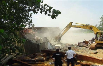 经营者不配合,工作人员就一趟趟的上门做工作。专班小组充分运用多种宣传形式,先后在执法艇、运政船、非法码头等地方悬挂宣传标语100余幅,公告200余张,宣传车在江堤码头,街头巷尾巡回滚动播放宣传片100余次,营造了强大的舆论攻势,取得了广大群众的理解与支持。同时,各职能部门依据法律条款,逐家逐户逐个码头下达执法文书,尽量动员广大私营业主自动拆除违法码头、堆场。