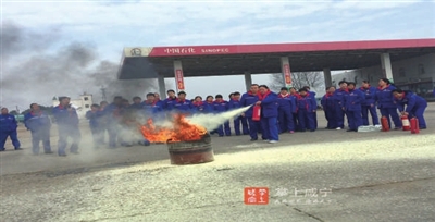 近日,中石化咸宁公司直属零售片区举行大型应急预案演练。本次应急预案演练以比赛的形式展开,参加演练的70名加油站员工分成7组,依次开展了摩托车起火、营业室被抢劫、车辆油箱口溢油应急处置演练。演练比赛结束后,片区还组织了一次集体灭火演练。