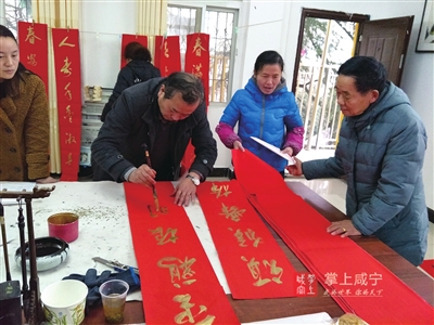 “这幅对联好,我要这幅,很应景。”社区居民唐大妈看了一圈后,挑中了一副“接财接福接平安,迎喜迎春迎富贵”的对联,高兴地让社区的工作人员帮忙折叠好带走。另一旁,咸安区老年书画家协会浮山分会会长石鉴河正忙不迭地写着对联。红色的纸、金色的字,挥毫泼墨间,一副副寓意美好的对联就诞生了。不少居民还围在石鉴河旁边要求“私人订制”,挑选中意的对联请石鉴河帮忙书写。