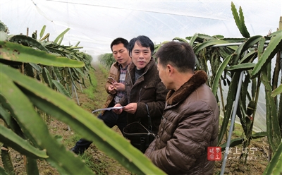 回来后,村里选拔了几名年轻干部,跟着专家一起学习火龙果种植技术。村主任汪洪良就是火龙果种植技术“学习班”的排头兵。对果蔬种植完全陌生的他,如今俨然是一位火龙果种植专家:“建园要选择地下水位在0.8 m以下,pH值5.5-7.5,避风向阳的地方;当气温降至10℃-12℃时,盖外膜,下霜以前,盖内膜,当内膜内温度低于0℃,开始结冰时,可在夜间设加温炉进行增温……”汪洪良说,从园地规划到起垄、栽培,从土、肥、水管理到整形修剪,从花果管理到越冬防冻,市农科院的专家团队持续为基地提供技术指导,火龙果终于在这片贫瘠的土地扎下根。