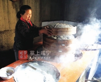 让通山人更爱的还有一种粑——米粑仔。米粑仔是个精细活,首先要把米粒里的砂尘摘出来,清洗干净,再用清水浸泡十个小时后又清洗一遍,此时才能将米粒磨成米浆。米浆经过十二小时发酵后,用木质雕花印刻成一个个雕花小圆粑,放入锅内蒸熟即可。团圆之时,客人来访,都可以端上米粑仔,或甜酒煮粑,或白菜茎叶煮粑,或鸡蛋煎粑,或火炉烤糍粑……无粑不欢,无粑不年的通山人,就这样深深爱着,爱了千年爱万年。
