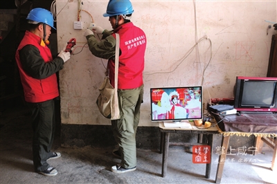 为解决农村供电卡口难题,自2015年9月开始,咸宁供电公司启动配网运维专项整治,完成配电线路通道整治3.7万处,完善设备、安全标识牌24.4块。图为今年大年初一,位于通城县黄龙山的花园村村民吴超家恢复供电后,一家人围着电视机重温春晚。 谌胜蓝 桂丽娟/摄