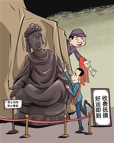 网友@大唐在汉私信华商君投诉:游陕西铜川药王山,本抱着虔诚之心去摩崖造像参观,却发现文物被摸得光溜。游客花钱买个红带子,就能去摸文物“图个吉利”,这容易对文物造成伤害。