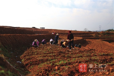 在崇阳县石城镇方一村,当地村民在政府及茶叶种植大户的带领下, 将千余亩荒山开垦为线条曲缓、流畅的茶梯田。2月14日,村民将成千 上万株优质茶苗悉心栽进土壤。这里将成为崇阳县又一大茶叶生产基 地,引领当地村民走上致富之路。 陈婧/摄