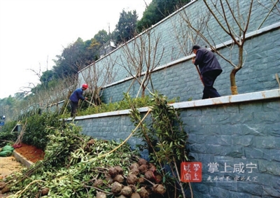 近日,记者在市区月亮湾山体修复工程施工现场看到,工人正紧张忙碌在绿化带内栽种苗木,工程完工后月亮湾将添新景。 记者 赵骥/摄