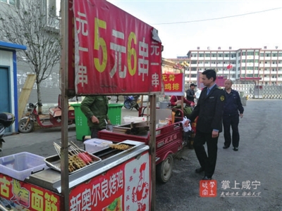 “这里是学校门口,你们围在路边做生意,影响学生出行,也不安全。”当天下午5时许,执法人员一行来到咸安区永安中学门口,已经有6个流动摊贩依次在校门口两边摆好摊,为迎接放学时段的生意做准备。眼见执法人员上前推车,摊贩们很无奈的搬离了现场。