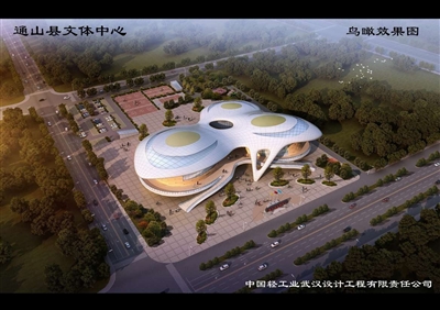 该项目主体建筑造型新颖,灵秀动人,宛如鸟归山林,生机勃勃;好比大鹏展翅,蓄势待飞,预示通山人民幸福安康,经济社会全面发展。