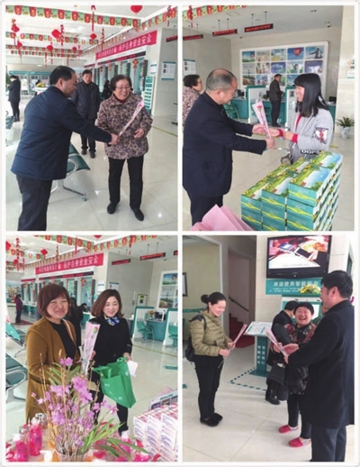 赤壁支行行长镇万新带领工作人员在各网点向前来办理业务的女客户馈赠鲜花和礼品,让广大女客户感受到浪漫贴心的节日祝福!