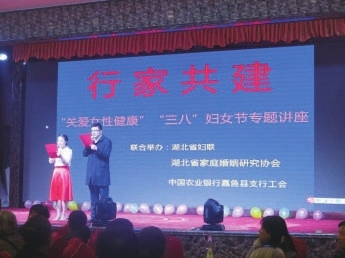 嘉鱼支行在嘉鱼国宾楼开展“行家共建·关爱女性健康”三八妇女节”主题讲座,讲座活动由支行工会与湖北省妇联、湖北省家庭婚姻研究协会联合举办,特别邀请了武汉大学医院教授、主任医生廖浩磊为全行女职工及家属讲授《女性公民身心健康维护技巧》,120余名在岗、内退、离退休女职工及家属参加活动。