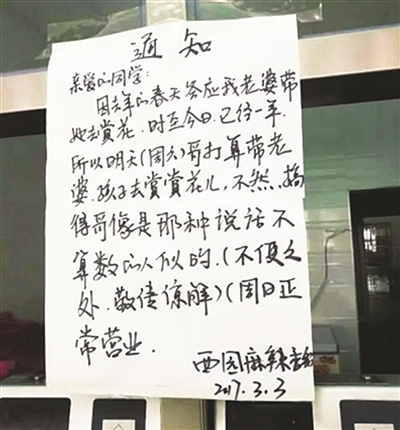 从前年中秋开始,武汉生物工程学院厨师侯高红,先后贴出了4张停业通知单——“中秋相亲停业一天”“相亲失败再相亲停业两天”“老婆临产停业三天”“全家赏花停业一天”。看到这些另类通知的同学们不淡定了:这完全就是一条“人生赢家之路”嘛。据记者了解,这些“通知”也许还将继续……