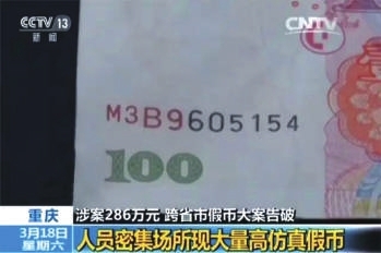 2016年底,重庆市渝中区警方陆续接到群众反映,有人在重庆菜园坝火车站、汽车站等人员密集场所,大规模使用假币。不久,多家银行柜台也向警方报案称,有高仿真胶版印刷人民币出现。民警立即展开调查,发现这些收缴来的假币确实属高仿版人民币,且冠字号都相同,很可能是同一伙人所为。